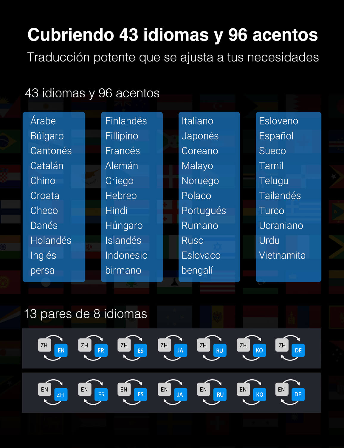 Actualmente admitimos 43 idiomas y 96 variantes de acento, ofreciendo una de las coberturas más completas del mercado: